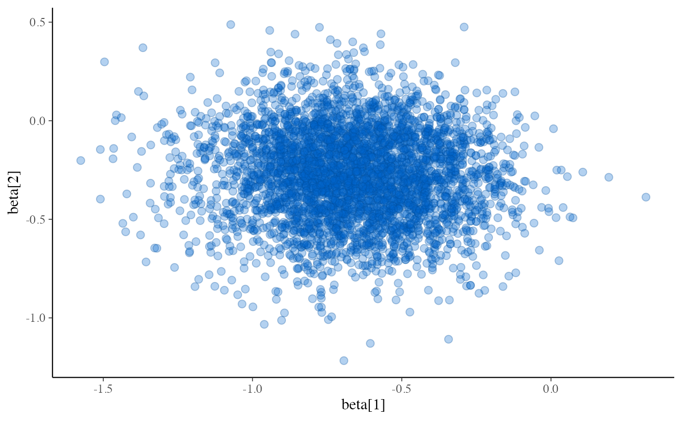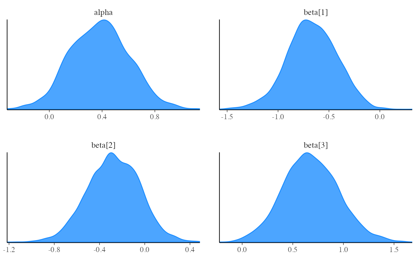 # \dontrun{ # logistic regression with intercept alpha and coefficients beta fit <- cmdstanr_example("logistic", method = "sample") # returned as 3-D array (see ?posterior::draws_array) draws <- fit$draws() dim(draws)#> [1] 1000 4 105#> 'draws_array' num [1:1000, 1:4, 1:105] -66.8 -65.2 -65.1 -64.4 -64.9 ... #> - attr(*, "dimnames")=List of 3 #> ..$ iteration: chr [1:1000] "1" "2" "3" "4" ... #> ..$ chain : chr [1:4] "1" "2" "3" "4" #> ..$ variable : chr [1:105] "lp__" "alpha" "beta[1]" "beta[2]" ...# can easily convert to other formats (data frame, matrix, list) # using the posterior package head(posterior::as_draws_matrix(draws))#> # A draws_matrix: 6 iterations, 1 chains, and 105 variables #> variable #> draw lp__ alpha beta[1] beta[2] beta[3] log_lik[1] log_lik[2] log_lik[3] #> 1 -67 0.37 -1.25 -0.25 0.80 -0.44 -0.25 -0.31 #> 2 -65 0.38 -0.56 -0.12 0.97 -0.52 -0.26 -0.34 #> 3 -65 0.37 -0.95 -0.43 0.66 -0.49 -0.37 -0.52 #> 4 -64 0.24 -0.48 -0.17 0.67 -0.58 -0.36 -0.48 #> 5 -65 0.19 -0.50 -0.41 0.47 -0.61 -0.47 -0.77 #> 6 -67 0.89 -0.80 -0.50 0.78 -0.34 -0.54 -0.41 #> # ... with 97 more variables# or can specify 'format' argument to avoid manual conversion # matrix format combines all chains draws <- fit$draws(format = "matrix") head(draws)#> # A draws_matrix: 6 iterations, 1 chains, and 105 variables #> variable #> draw lp__ alpha beta[1] beta[2] beta[3] log_lik[1] log_lik[2] log_lik[3] #> 1 -67 0.37 -1.25 -0.25 0.80 -0.44 -0.25 -0.31 #> 2 -65 0.38 -0.56 -0.12 0.97 -0.52 -0.26 -0.34 #> 3 -65 0.37 -0.95 -0.43 0.66 -0.49 -0.37 -0.52 #> 4 -64 0.24 -0.48 -0.17 0.67 -0.58 -0.36 -0.48 #> 5 -65 0.19 -0.50 -0.41 0.47 -0.61 -0.47 -0.77 #> 6 -67 0.89 -0.80 -0.50 0.78 -0.34 -0.54 -0.41 #> # ... with 97 more variables# can select specific parameters fit$draws("alpha")#> # A draws_array: 1000 iterations, 4 chains, and 1 variables #> , , variable = alpha #> #> chain #> iteration 1 2 3 4 #> 1 0.37 -0.074 0.50 0.548 #> 2 0.38 -0.074 0.46 0.098 #> 3 0.37 0.016 0.57 0.363 #> 4 0.24 0.016 0.66 0.981 #> 5 0.19 0.542 0.22 -0.174 #> #> # ... with 995 more iterationsfit$draws("beta") # selects entire vector beta#> # A draws_array: 1000 iterations, 4 chains, and 3 variables #> , , variable = beta[1] #> #> chain #> iteration 1 2 3 4 #> 1 -1.25 -0.59 -0.76 -0.503 #> 2 -0.56 -0.59 -0.47 -0.794 #> 3 -0.95 -0.61 -0.83 -0.589 #> 4 -0.48 -0.61 -1.14 -1.460 #> 5 -0.50 -0.81 -0.48 0.074 #> #> , , variable = beta[2] #> #> chain #> iteration 1 2 3 4 #> 1 -0.25 -0.36 0.14 -0.26824 #> 2 -0.12 -0.36 -0.02 -0.13334 #> 3 -0.43 -0.33 -0.34 -0.41513 #> 4 -0.17 -0.33 -0.14 0.00039 #> 5 -0.41 -0.10 -0.78 -0.49269 #> #> , , variable = beta[3] #> #> chain #> iteration 1 2 3 4 #> 1 0.80 0.70 0.067 1.24 #> 2 0.97 0.70 0.367 0.28 #> 3 0.66 0.83 0.329 0.99 #> 4 0.67 0.83 0.288 0.46 #> 5 0.47 0.53 0.447 0.83 #> #> # ... with 995 more iterations#> # A draws_array: 1000 iterations, 4 chains, and 2 variables #> , , variable = alpha #> #> chain #> iteration 1 2 3 4 #> 1 0.37 -0.074 0.50 0.548 #> 2 0.38 -0.074 0.46 0.098 #> 3 0.37 0.016 0.57 0.363 #> 4 0.24 0.016 0.66 0.981 #> 5 0.19 0.542 0.22 -0.174 #> #> , , variable = beta[2] #> #> chain #> iteration 1 2 3 4 #> 1 -0.25 -0.36 0.14 -0.26824 #> 2 -0.12 -0.36 -0.02 -0.13334 #> 3 -0.43 -0.33 -0.34 -0.41513 #> 4 -0.17 -0.33 -0.14 0.00039 #> 5 -0.41 -0.10 -0.78 -0.49269 #> #> # ... with 995 more iterations# can be passed directly to bayesplot plotting functions bayesplot::color_scheme_set("brightblue") bayesplot::mcmc_dens(fit$draws(c("alpha", "beta")))# example using variational inference fit <- cmdstanr_example("logistic", method = "variational") head(fit$draws("beta")) # a matrix by default#> # A draws_matrix: 6 iterations, 1 chains, and 3 variables #> variable #> draw beta[1] beta[2] beta[3] #> 1 -0.48 -0.083 0.76 #> 2 -0.42 -0.392 0.61 #> 3 -0.69 -0.101 0.40 #> 4 -0.95 0.079 0.11 #> 5 -0.63 0.063 0.28 #> 6 -0.50 0.473 0.14#> # A draws_df: 6 iterations, 1 chains, and 3 variables #> beta[1] beta[2] beta[3] #> 1 -0.48 -0.083 0.76 #> 2 -0.42 -0.392 0.61 #> 3 -0.69 -0.101 0.40 #> 4 -0.95 0.079 0.11 #> 5 -0.63 0.063 0.28 #> 6 -0.50 0.473 0.14 #> # ... hidden reserved variables {'.chain', '.iteration', '.draw'}# }